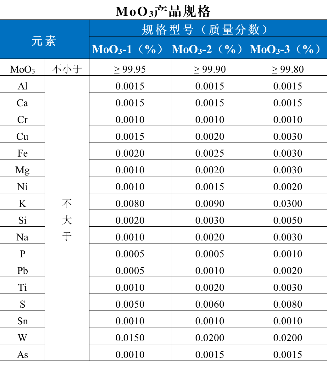 產(chǎn)品根據(jù)化學(xué)成分和用途不同,分為MoO3-1,MoO3-2,MoO3-3三個牌號。